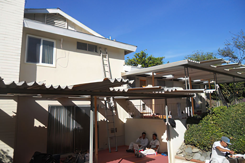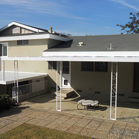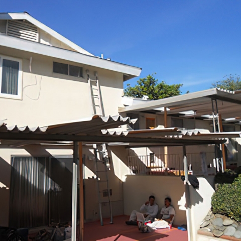 As part of this project we disassembled a large two-level, complex patio cover in order to paint behind it. The patio cover was metal and was sanded, primed and painted using special paints for metal. We were thankful that the weather cooperated with NO winds.Before we sanded, primed and painted the main house we power washed the entire building, we did stucco repair as needed and filled and sanded to repair the eaves.