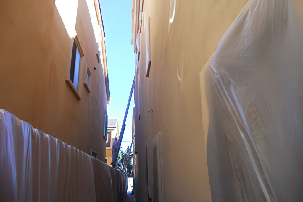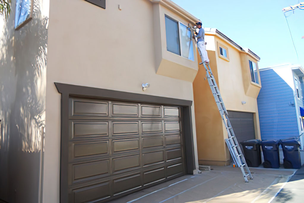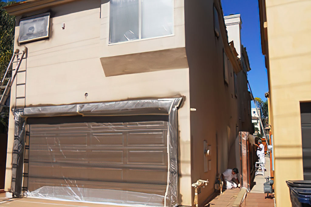 The home owner asked us to remove all of the newly installed gutters to maintain the manufacturers finish. We also painted the garage door because it is a large area to leave unpainted especially if was dirty or pitted at all. The overall effect of a the house will look better if its been completely freshly painted. Tight spaces demands the control of overspray and masking of ground and fences wherever possible. We take great care to make sure this is done right the first time, every time.